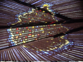 After making all four sections I sewed them together. This view from the back shows the sections clearly--and I rather like the way it looks a bit like a stained glass window. It is on my light box. At this point I was terribly disappointed in my star and considered redoing that part. It looked rather squashed to me. But my friend Betsy held my hand and kept me from doing anything immediately. She said she liked it and I got over it. It may be squished, but it goes well with the dancing tree.